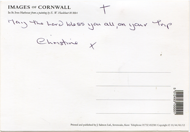 Une personne d’un certain âge Christine nous aborde et nous discutons de notre périple. Elle connait le camping à la ferme de Lansallos. Elle nous offre une carte postale dédicacée