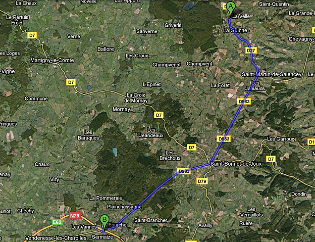 Après la N79, nous bifurquons sur la D983 vers Saint Bonnet de Joux puis la D27