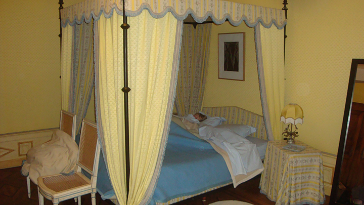 Nous nous installons dans la chambre, guidés par notre hôtesse. Ce soir nous dormirons dans un lit à baldaquin qui n’est pas d’époque et pas à notre goût.