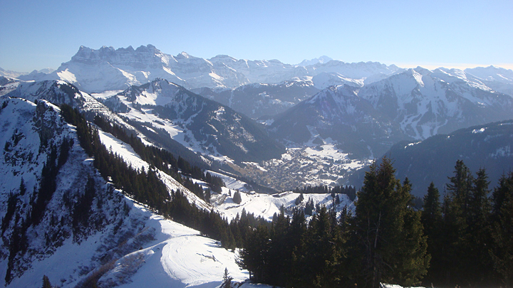 vue de la Pointe de Recon 1962 m, les chalets du Mouet et tout en bas Châtel