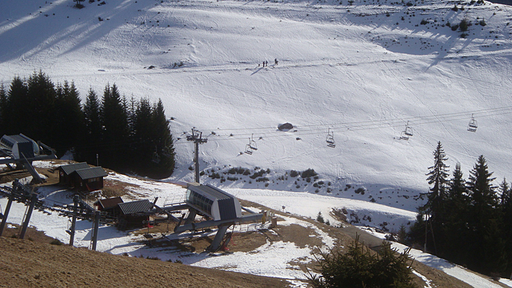 L’arrivée du télésiège du Petit Châtel et le départ du télésiège de Barbossine sans neige.
