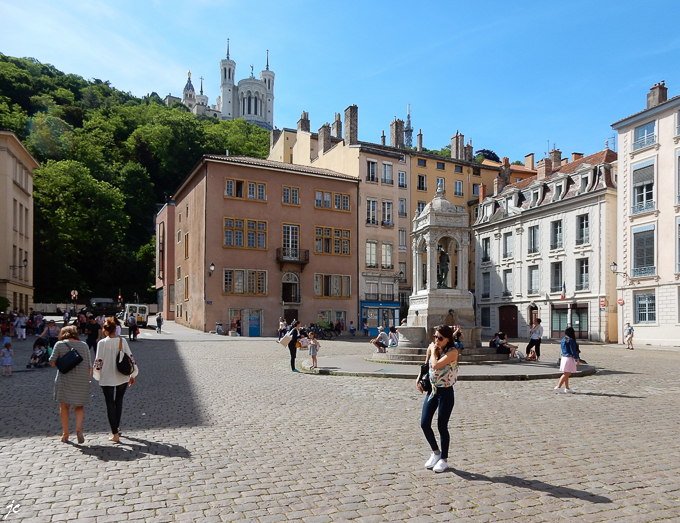 Pour le retour à l’hôtel nous traversons la place Saint Jean avec en son centre la fontaine due à René Dardel et le sculpteur Jean Marie Bienaimé Bonnassieux : Saint Jean baptisant Jésus et en arrière plan, sur les hauteurs, la basilique