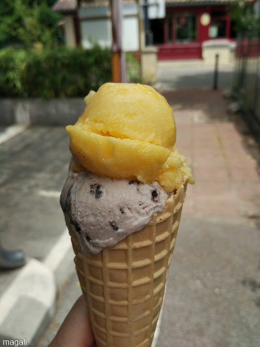 Nous dégustons de bonnes glaces au café L’Entrain près de la gare