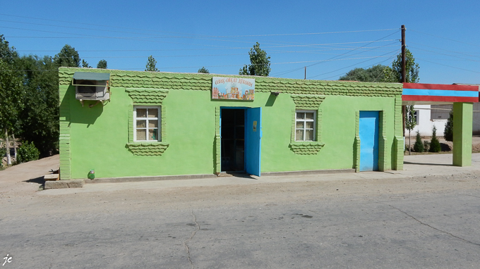 La soif se fait sentir, un arrêt à l’épicerie dans la ville de Bustan Tyube (озик овкат дукони = magasin de denrées alimentaires) s’impose pour faire le plein
