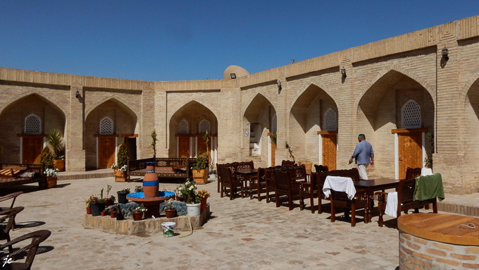 Dans la Muhammad Rahimkhan II Madrasah, notre hôtel Muso To’ra, la cour intérieure de l’ancienne médersa et l’entrée des chambres disposées tout autour