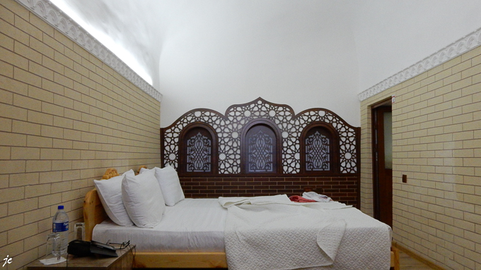 Une matinée bien remplie, premier contact avec l’Ouzbékistan, ses paysages, sa population et ses vestiges du passé. Nous reprenons notre minibus direction Khiva et notre hôtel situé dans une ancienne médersa : la Muhammad Rahimkhan II Madrasah au cœur de Itchan Kala, la ville intérieure.