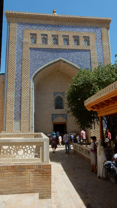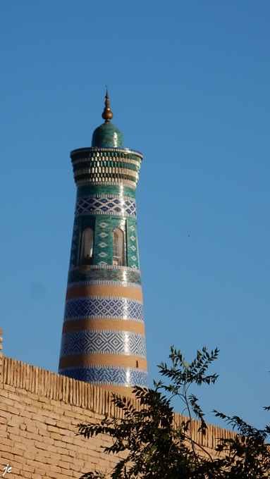 La médersa Islam Khodja et son minaret datent respectivement de 1908 et 1910. Islam Khodja était le beau-père et le grand vizir du khan Isfandiar Khan. Les deux monuments témoignent des dernières architectures islamiques notables en Asie centrale. Le minaret, haut de 45 mètres, est le plus haut de Khiva. Son diamètre diminue au fur et à mesure qu’il prend de la hauteur. Des bandes de céramiques bleues et blanches alternent avec des briques de couleur ocre