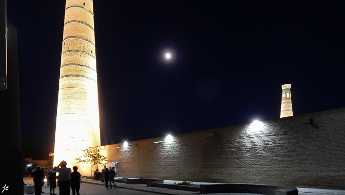 La luminosité décline et la ville s’illumine. Khiva by night, le minaret inachevé, Kalta Minar se pare d’or