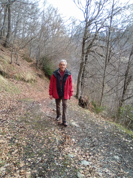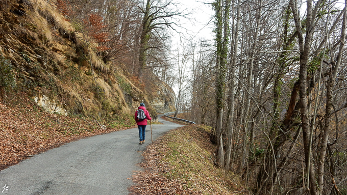 Nous décidons de monter par la route goudronnée qui dessert quelques habitations et qui se termine en cul de sac prolongé par un sentier, peu de chance que nous soyons dérangés par les voitures (!). La route tel un serpent se faufile entre les arbres