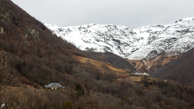les sommets enneigés et la ferme Igau au belvédère d’Aoumède