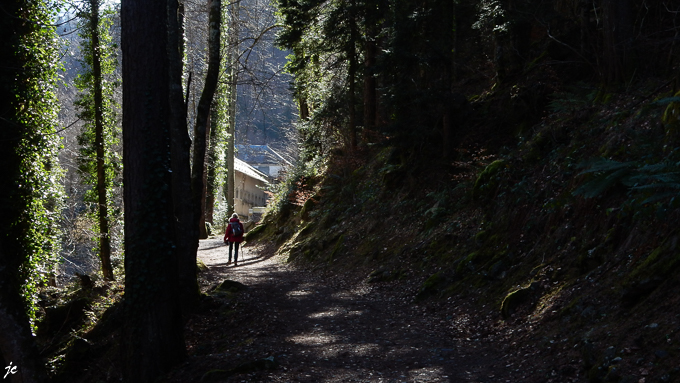 Nous longeons le Lutour, une demi-heure plus tard, nous distinguons les bâtiments de La Fuitière, les constructions se découpent en contre jour sur l’autre rive du torrent
