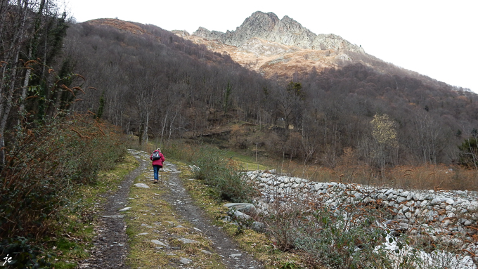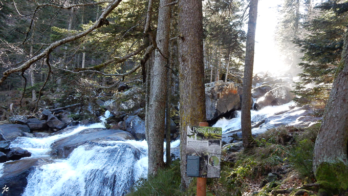 Nous décidons de continuer n’ayant aucune explication sur les raisons de cette fermeture et 1,5 km plus loin le chemin est parti au fond de la gorge, un monticule de terre barre la piste, nous faisons demi tour au niveau de la cascade dont l’eau est drainée par les ravins de Pouey Hérèche (pic de Piquet, altitude 1963 m) et de la Laoune (pic de Viscos, altitude 2141 m)