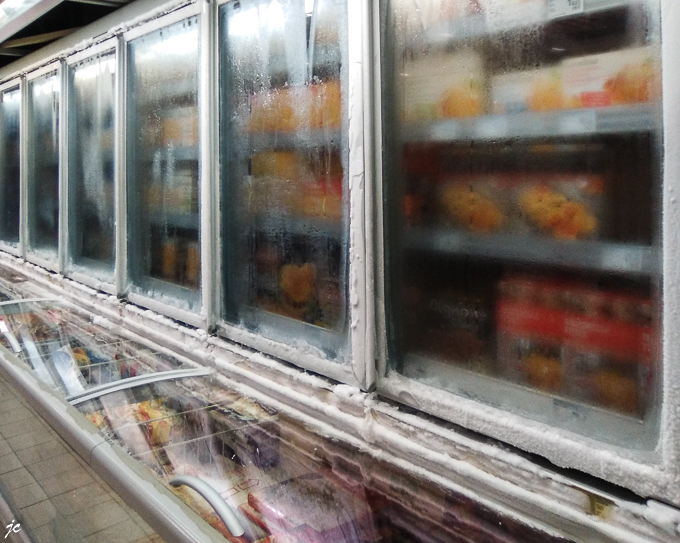 Profitant de la proximité du Carrefour « Montagne », nous pénétrons dans un bâtiment plus proche du réfrigérateur que d’un commerce, le personnel travaille en veste matelassée et moufle, les frigos sont recouverts de glace !