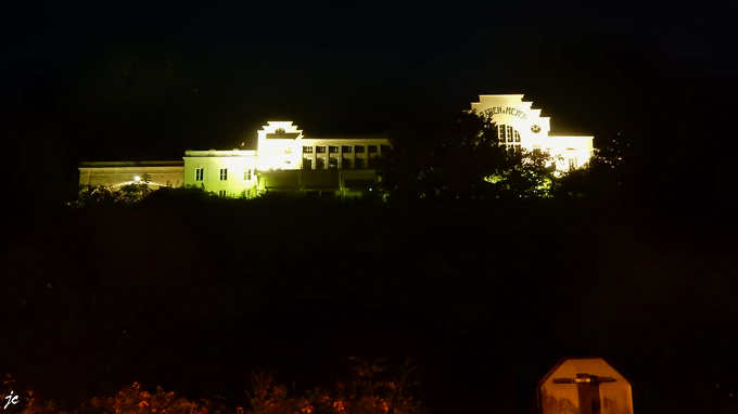 A 7h07, l’église de Parnay noyée dans la lumière chaude des projecteurs contraste avec un fond de ciel entrain de s’éclaircir