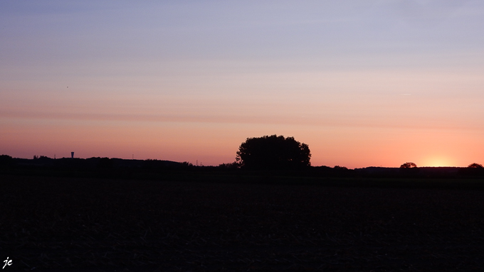 7h40, le lever de soleil près de Charcé St Ellier sur Aubance avec la silhouette du château d’eau de Coutures à gauche