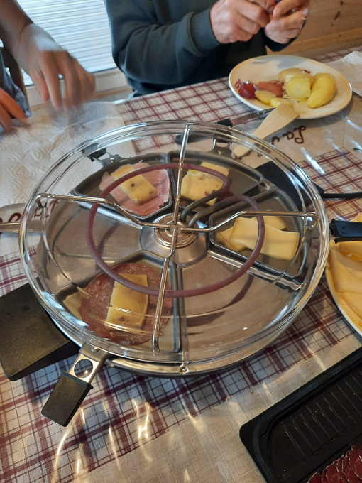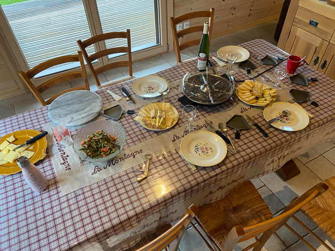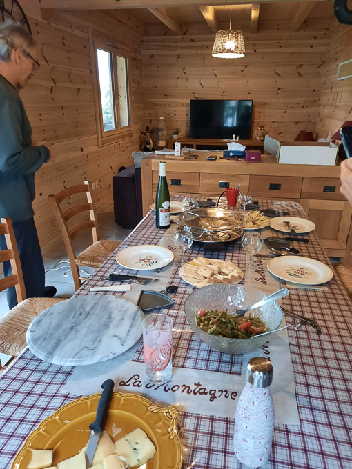 pour le moral, un déjeuner copieux : salade de haricots verts + tomates + maquereau Belle Iloise, raclette arrosée d’un blanc d’Alsace et pour terminer café et tarte à la quetsche