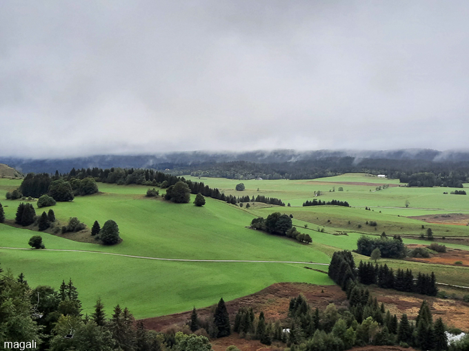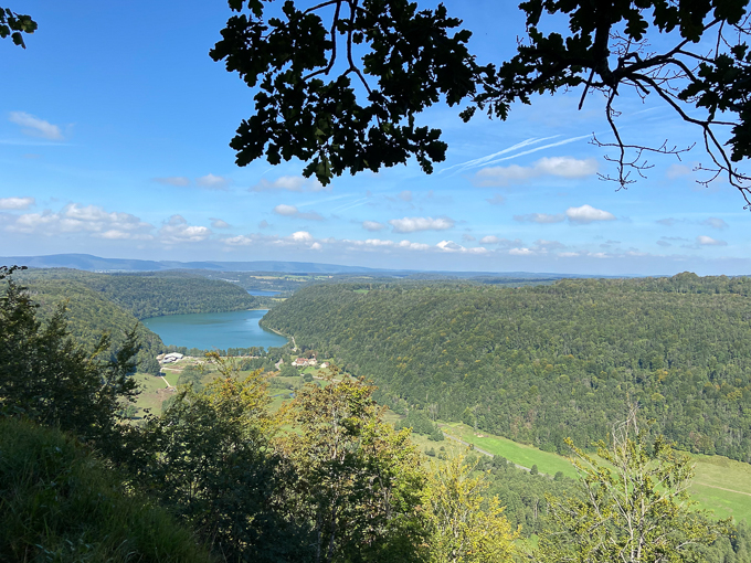 Pour enfin surgir sur le plateau et découvrir la vue au belvédère de la Dame Blanche (à Saugeot 39130) alt 722m sur le bassin du Hérisson et les lacs du Val, du Chambly