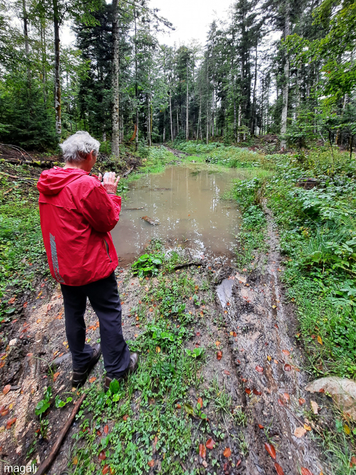Pour le retour, nous choisissons la direction de Châtelblanc à travers la forêt de pin sur un chemin qui s’avère détrempé et entrecoupé de « lacs » ce qui nous oblige à faire du hors chemin. Par où passer ? Magali hésite !