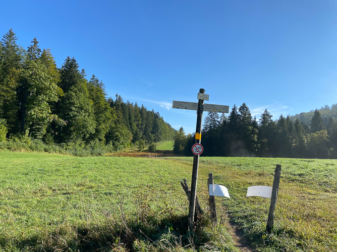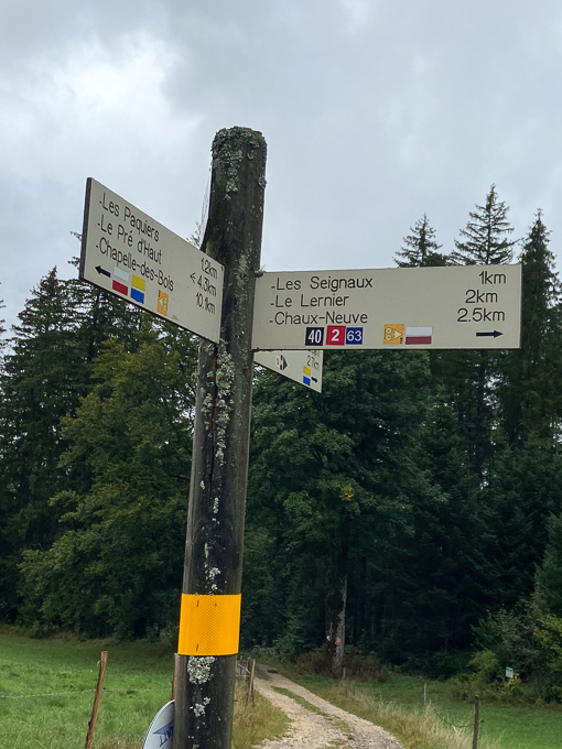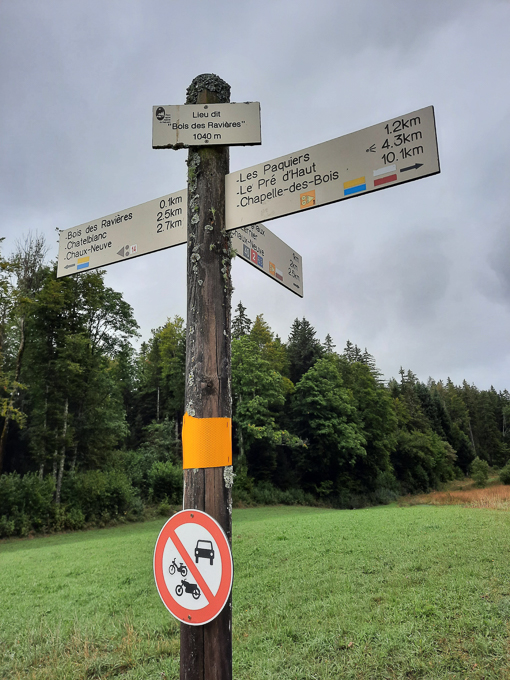 Nous sommes dans le Jura, le balisage des randonnées au lieu dit « Bois des Ravières » 1040m, 3 directions, est toujours parfait