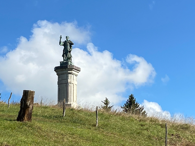 Le gîte n’étant disponible qu’à partir de 16h ! nous partons randonner à la source du Doubs. Au passage nous saluons Simon qui nous toise du haut de son piédestal, longeons le Doubs jusqu’à la source