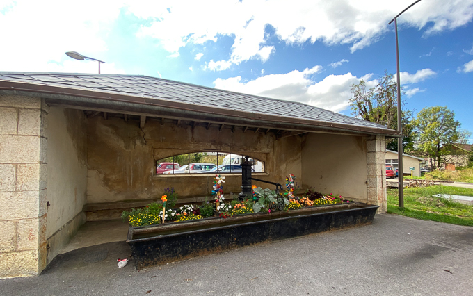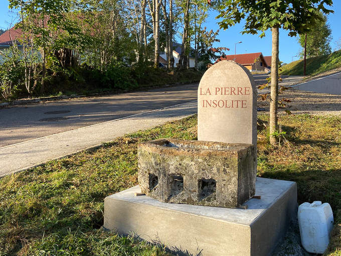 arrivés au lavoir (alt 998m), nous prenons à droite et montons dans le lotissement de La Pierre Insolite