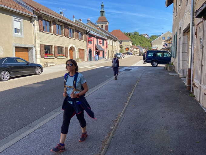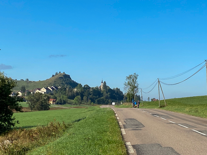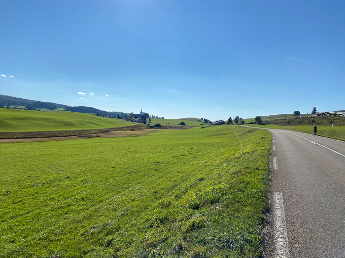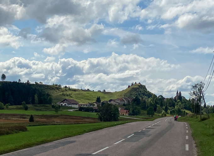 Simone en « lonesome girl » sur la D437, arrive sur Chaux Neuve dont on aperçoit le clocher de l’église