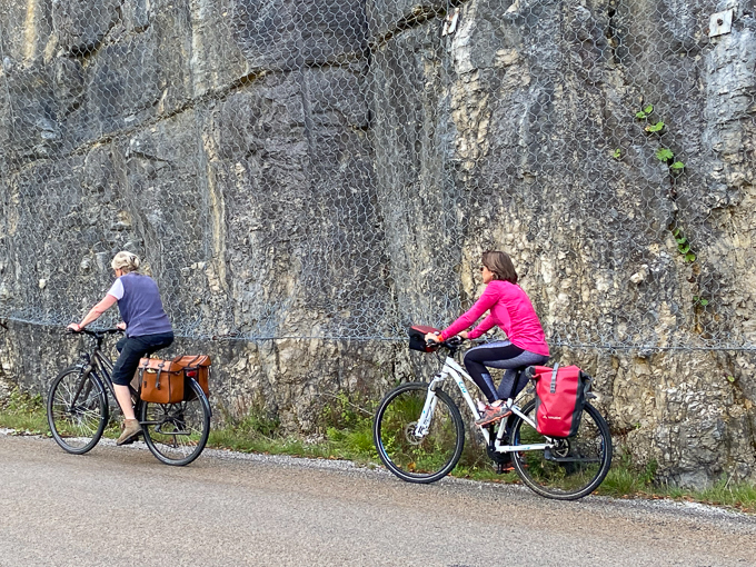 Pédalant tranquillement le long du lac, nous sommes dépassés par trois cyclistes « bonjour ! », puis d’autres cyclistes « y en a-t’il encore beaucoup ? » demande Simone, et la conversation est partie. Nous apprenons qu’elles sont sur le chemin du retour et qu’elles vont à Strasbourg, une dizaine de femmes et un homme, cherchez l’erreur !