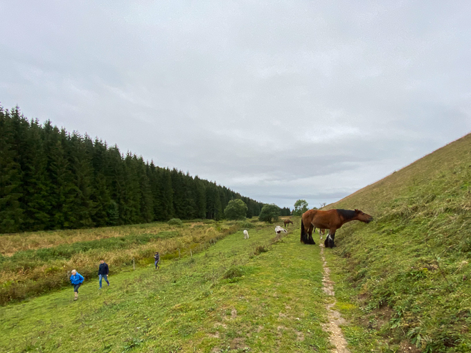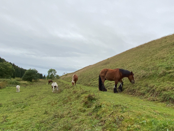 Il traverse un pâturage où paissent les chevaux en plein milieu du sentier