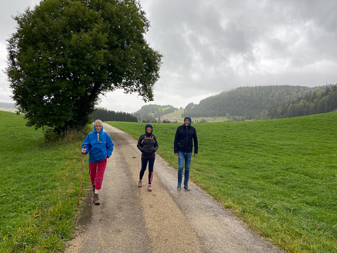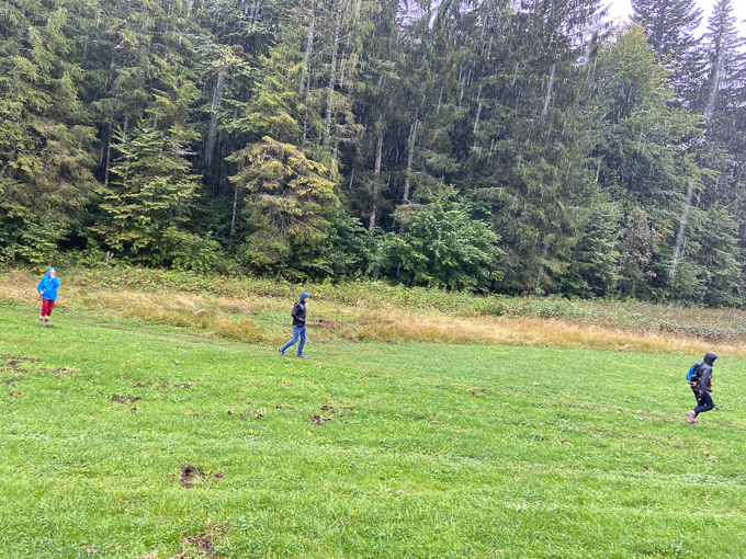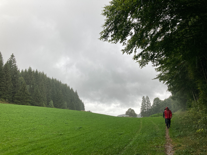 puis nous bifurquons sur le sentier détrempé, en file indienne pour ne pas marcher directement dans l’herbe
