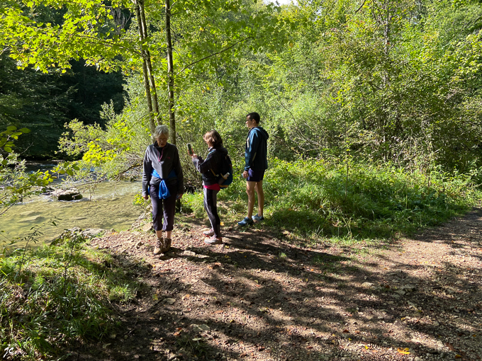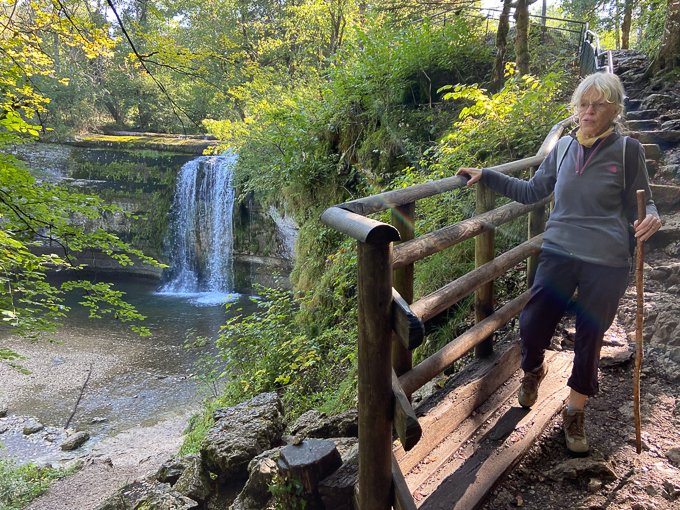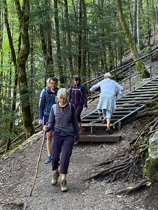 Simone ouvre la marche et guide tout ce petit monde vers ? la passerelle sarrazinne. Elle enjambe le hérisson permet l’accès au point de vue au dessus de la cascade