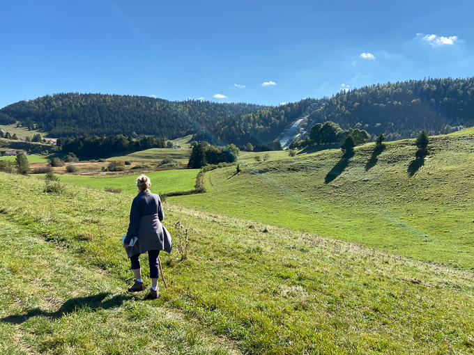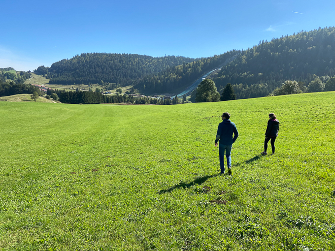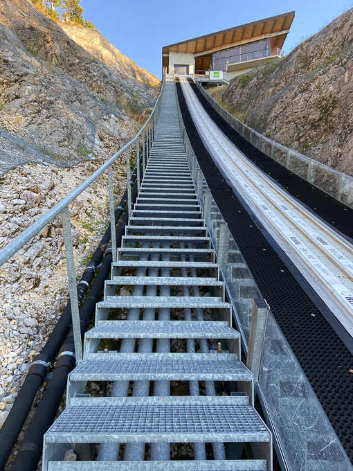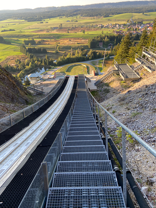 Nous grimpons par un sentier au sommet du tremplin de saut à ski, une montée très raide et caillouteuse sur les vestiges des pistes de ski
