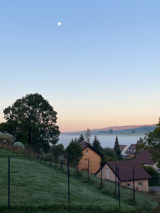 La sortie matinale en attendant que tout le monde ait pris le petit déjeuner : l’église de Chaux Neuve, le tracteur bleu, la lune et la brume à Chaux Neuve
