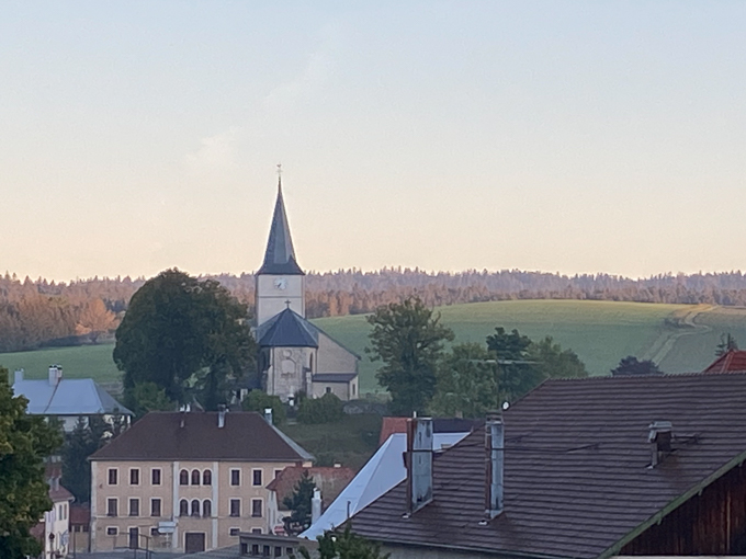 A 10h 41, nous arrivons à Mouthe (25240) devant l’église de l’Assomption et son clocher typique. Le Picasso et le Nissan Qashqai de Magali sont garés sur la place devant l’église