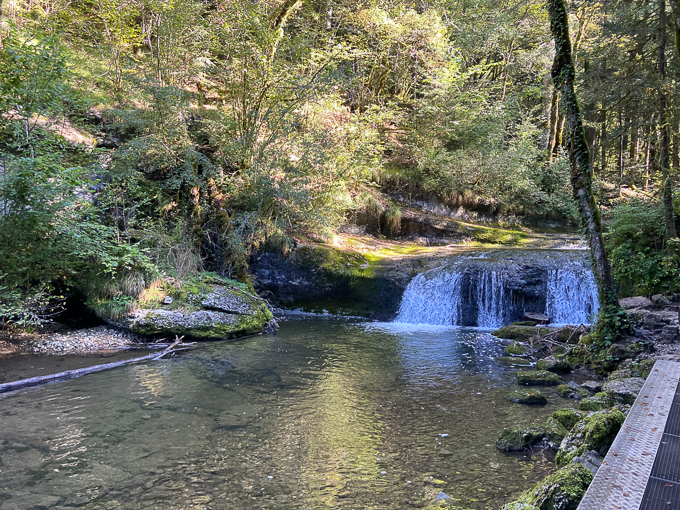 massive, voila un mot qui pourrait la définir. Cette chute d’eau est impressionnante par sa taille et sa disposition dans la clairière. La chute est rude et franche, en contraste avec son environnement. Une belle surprise après la promenade dans les sapins hauts et droits du chemin qui y mène.
