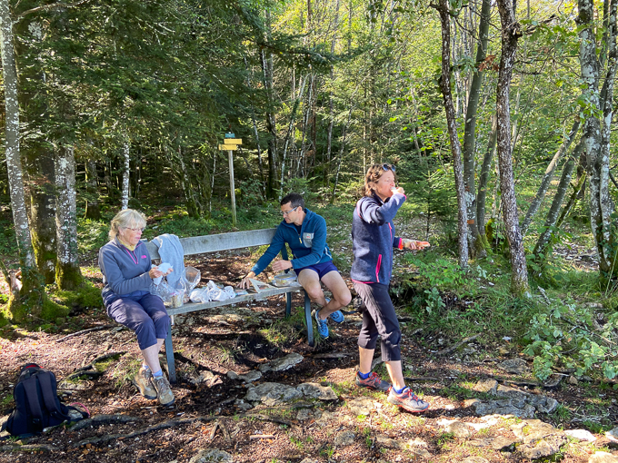 Nous retrouvons le soleil au pied de Châtelblanc sur une petite route parallèle à la départementale et nous en profitons pour un petit goûter après le passage à la boulangerie de Foncine-le-Haut