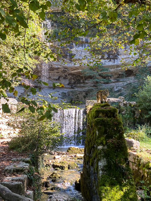 Nous retrouvons le sentier des cascades du Hérisson, la cascade du saut Girard où le lynx guette sa proie, prêt à bondir