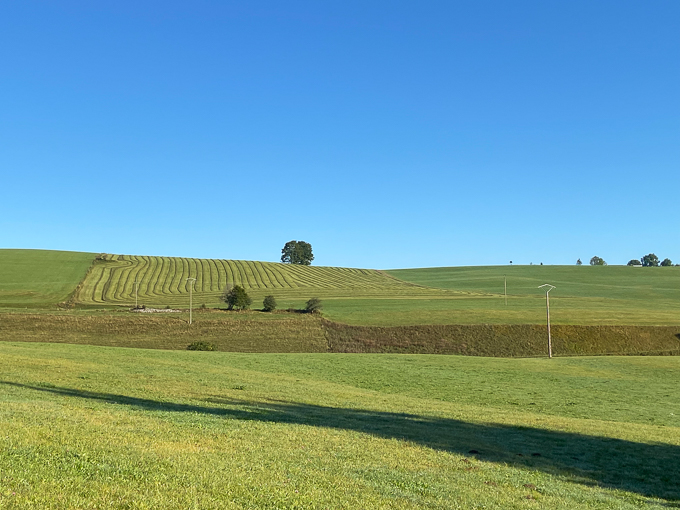 Devant l’église les champs des Petites Côtes aux motifs géométriques et un magnifique ciel bleu, une atmosphère champêtre