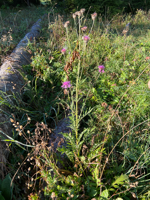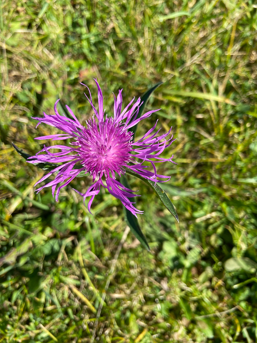 les vaches n’ont pas tout brouté, il reste la centaurée jacée (Centaurea jacea), appelée aussi tête de moineau, fleur de galant, herbe d’amour, bleuet rose ou ambrette