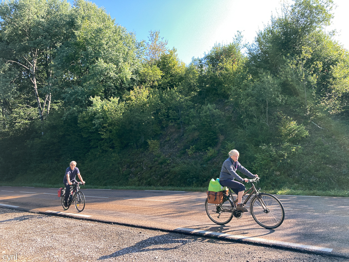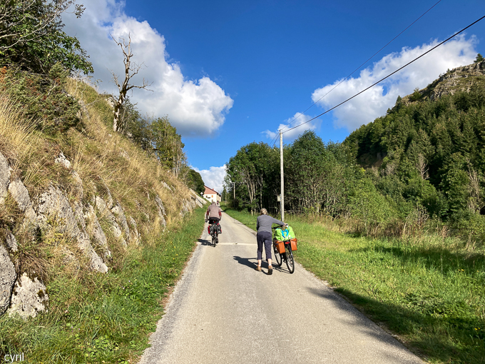 Matinée de transition, dans un premier temps, nous quittons Cerniébaud pour Mouthe. Devant nous sur la D19 à la sortie de Cerniébaud (39250), Magali et Cyril. Ils nous précèdent dans la montée au col de St Sorlin