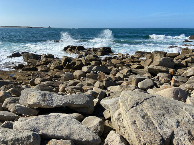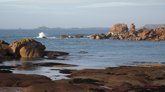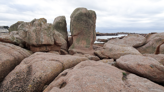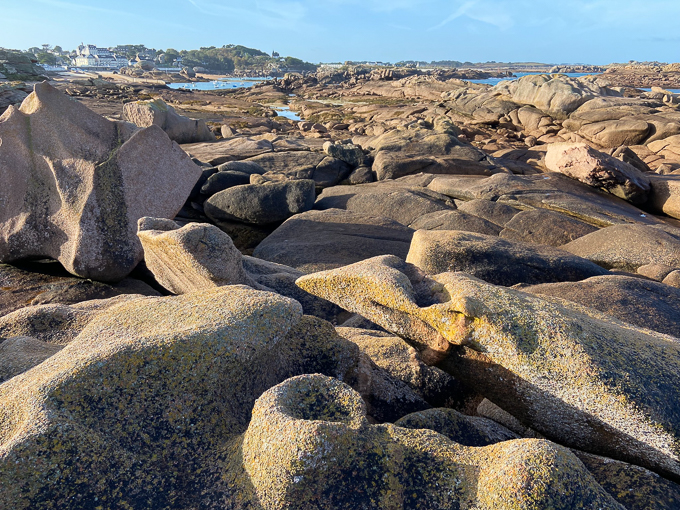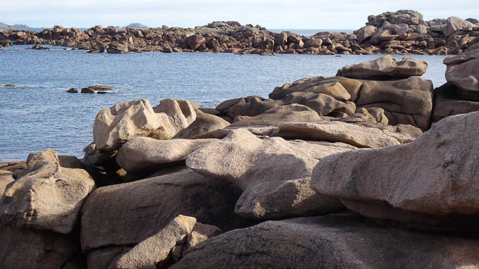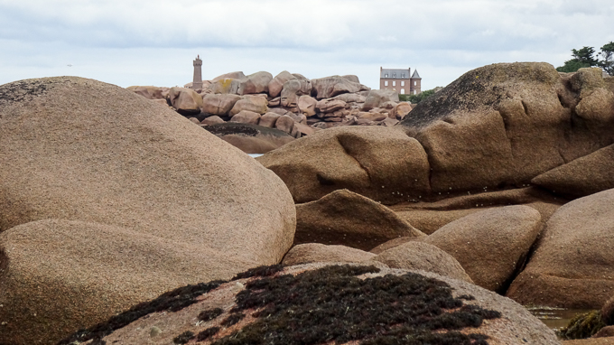 Impossible de progresser en ligne droite, j’utilise les failles entre deux rochers s’ils sont trop imposants, je grimpe sur les plus petits, progressent en sautillant de l’un à l’autre et parfois la civilisation émerge de ce chaos : le phare de Mean-Ruz et la maison du Littoral à Perros-Guirec