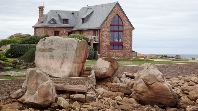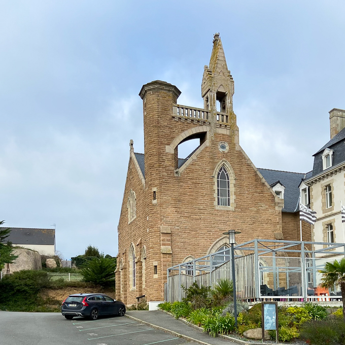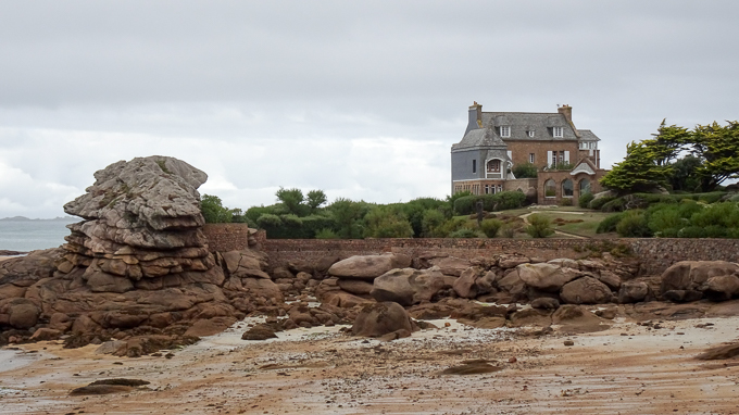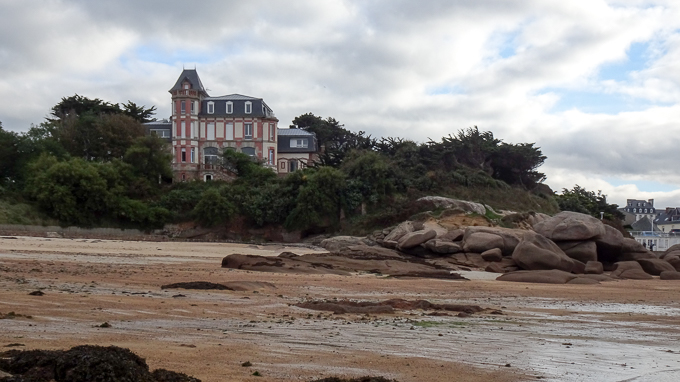 puis visitons Trégastel sur le chemin de retour. Nous passons par le Park Hôtel Bellevue et sa chapelle et les deux maisons étonnantes ; la première par sa taille et son architecture de château et la deuxième par sa forme et sa situation insolite au milieu de maisons basses