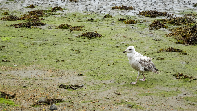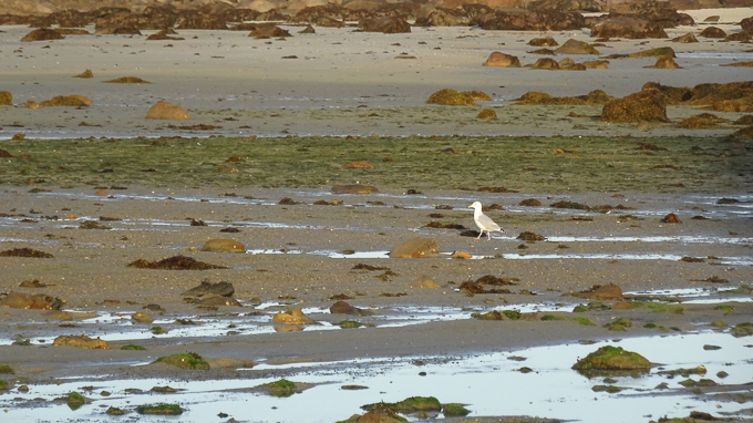 à ses pieds, les goélands sur l’estran, cherchent leur nourriture, sur la deuxième photo, un juvénile premier été est reconnaissable à son plumage et son bec