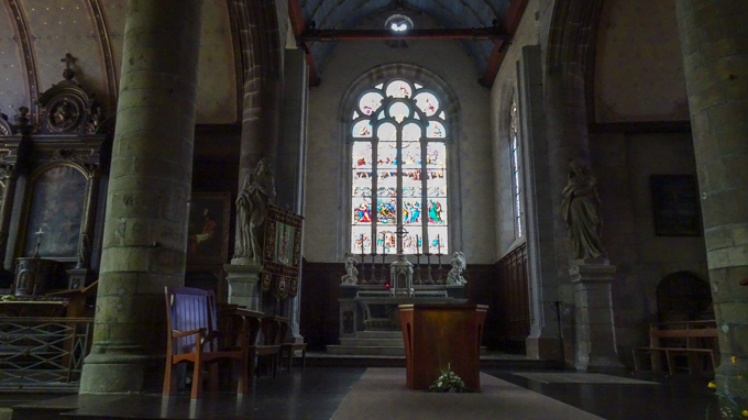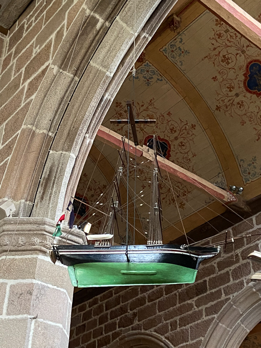 A environ 50 m du but, ne voyant pas l’église, Simone jette l’éponge et retourne au gîte (+2,7 km) tandis que je continue et je découvre la fameuse église paroissiale Ste-Anne-et-St-Laurent située au milieu du bourg de Trégastel