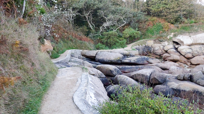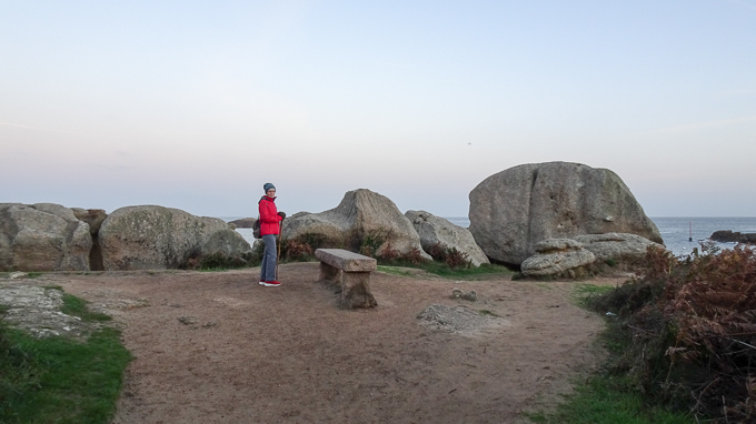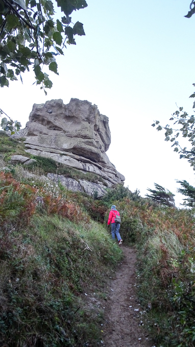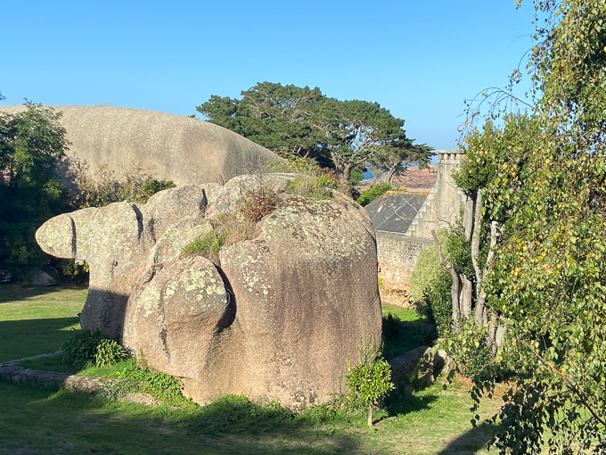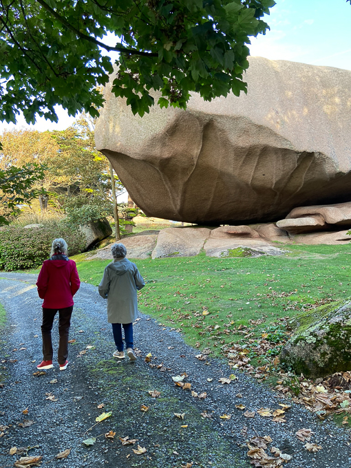 Un temps magnifique en ce début octobre, une douceur incroyable, il est 19 h lorsque nous partons vers le sentier du littoral, le chemin des douaniers qui longe la propriété. Sur le chemin dans le parc du gîte, Gisèle et Simone ne semble pas particulièrement impressionnées par le gigantisme du rocher