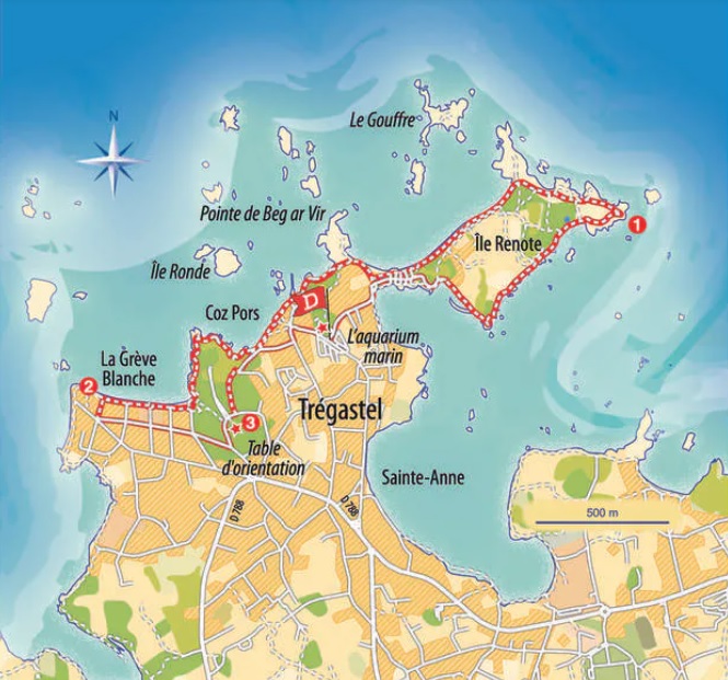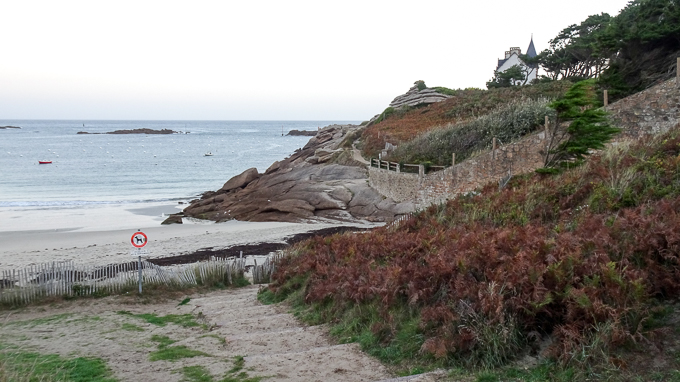 Le sentier du littoral longe la plage du Coz-Pors, à son extrémité, il grimpe vers le Nord-Ouest, vers un point de vue, après le point de vue, il progresse vers le Sud, vers la Grève-Blanche, la plage de Trégastel