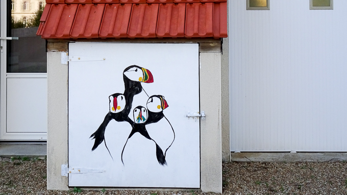 dans la rue des Calculots à Trégastel (22730) du street art, les macareux