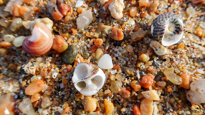 La mer s’est retirée laissant apparaitre les gravillons aux tons rouille, blanc, jaune, orange plus ou moins translucides, les coquilles, en prenant un peu de recul je découvre un chaos de rochers aux formes improbables