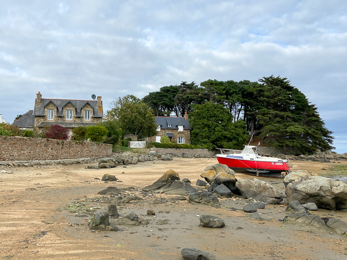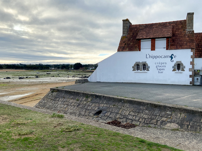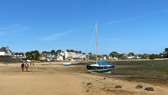 Ce matin, nous sortons explorer les alentours du gîte en dehors du littoral, repérer les commerces de bouche et noter les heures d’ouverture. Nous rentrons par le boulevard du Coz-Pors, la marée est descendante, j’en profite pour marcher dans le sable sur l’estran de la baie Ste-Anne