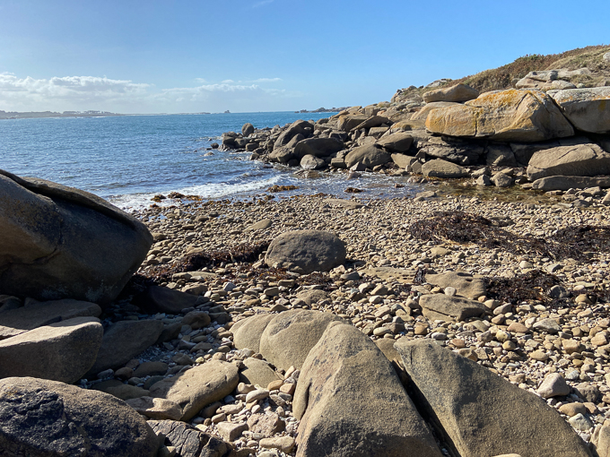 Devant nous la plage de Toull-Bihan, un dernier obstacle à surmonter, le chaos rocheux en travers du chemin
