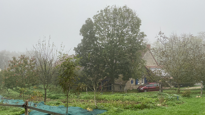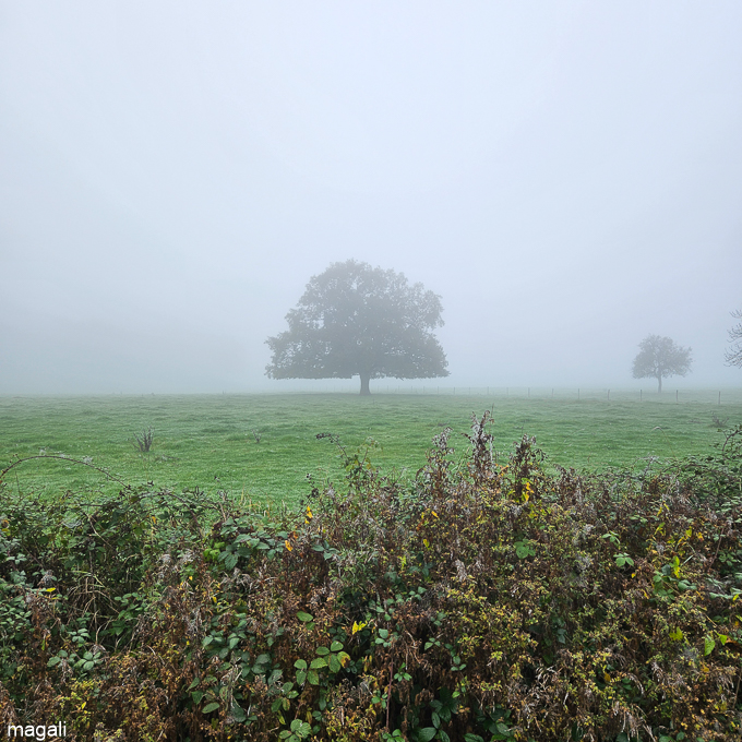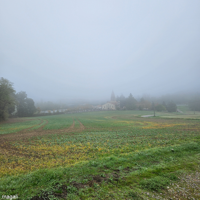 La brume persiste en ce début d’après-midi, Magali fait une boucle par Bransat et la campagne aux alentours du gîte